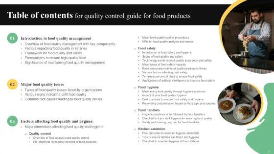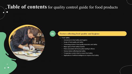 Do you have an important presentation coming up Are you looking for something that will make your presentation stand out from the rest Look no further than Table Of Contents Quality Control Guide For Food Products PPT PowerPoint. With our professional designs, you can trust that your presentation will pop and make delivering it a smooth process. And with Slidegeeks, you can trust that your presentation will be unique and memorable. So why wait Grab Table Of Contents Quality Control Guide For Food Products PPT PowerPoint today and make your presentation stand out from the rest Our Table Of Contents Quality Control Guide For Food Products PPT PowerPoint are topically designed to provide an attractive backdrop to any subject. Use them to look like a presentation pro.