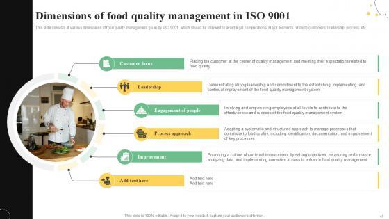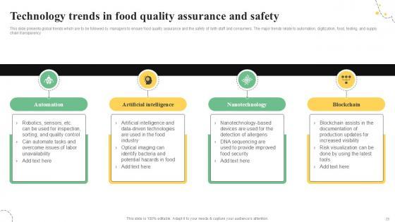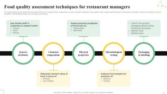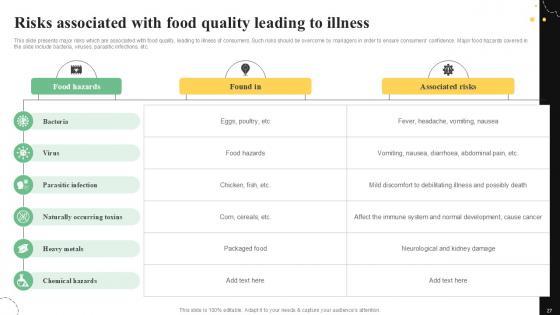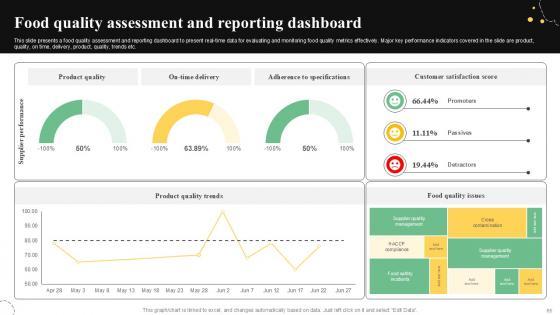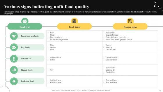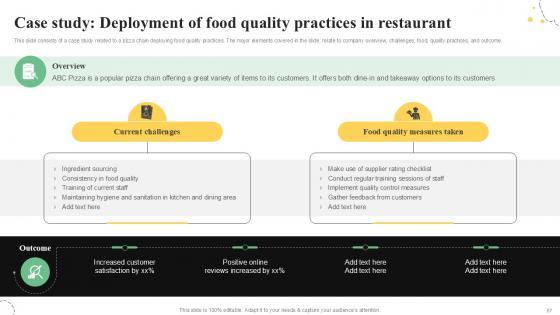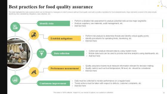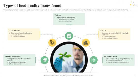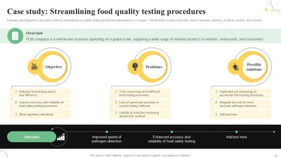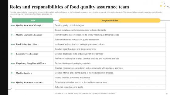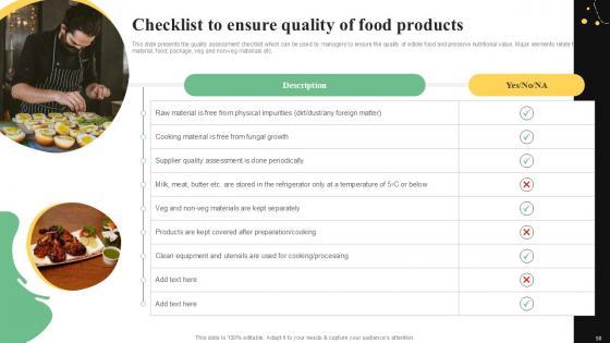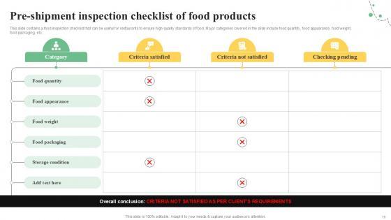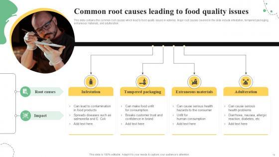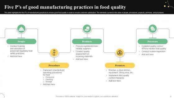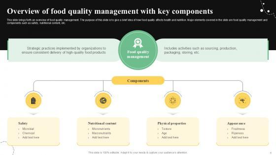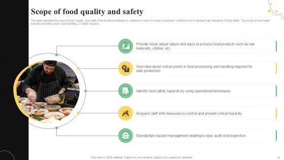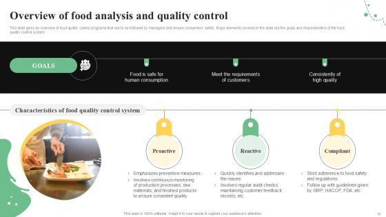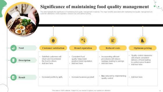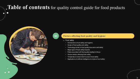 This Quality Control Guide For Food Products Ppt Example is designed to help you retain your audiences attention. This content-ready PowerPoint Template enables you to take your audience on a journey and share information in a way that is easier to recall. It helps you highlight the crucial parts of your work so that the audience does not get saddled with information download. This seventy seven-slide PPT Deck comes prepared with the graphs and charts you could need to showcase your information through visuals. You only need to enter your own data in them. Download this editable PowerPoint Theme and walk into that meeting with confidence. Our Quality Control Guide For Food Products Ppt Example are topically designed to provide an attractive backdrop to any subject. Use them to look like a presentation pro.