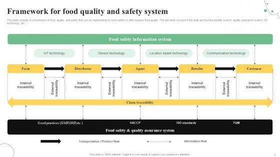 The slide exhibits food safety and quality control framework that assists in maintaining product health after packaging. Slidegeeks is here to make your presentations a breeze with Comprehensive Guide On Current Strategies Food Product Quality Control And System Framework With our easy-to-use and customizable templates, you can focus on delivering your ideas rather than worrying about formatting. With a variety of designs to choose from, you are sure to find one that suits your needs. And with animations and unique photos, illustrations, and fonts, you can make your presentation pop. So whether you are giving a sales pitch or presenting to the board, make sure to check out Slidegeeks first The slide exhibits food safety and quality control framework that assists in maintaining product health after packaging.