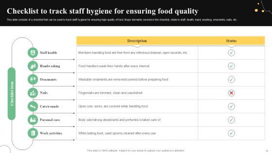 This slide provides information regarding the food quality control checklist which will be filled by project supervisor for quality controllable assessment. Deliver an awe inspiring pitch with this creative final food product quality control checklist food security excellence ppt portfolio layout ideas pdf bundle. Topics like improvement, malfunctioning, sanitation, quality indicators can be discussed with this completely editable template. It is available for immediate download depending on the needs and requirements of the user.