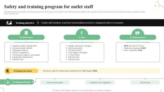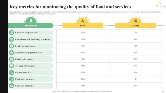 The slide covers KPIs that can be used to track and evaluate the quality of food and services for continuous improvement. Major metrics are customer complaint rate, food waste percentage, etc. Welcome to our selection of the KPIs To Control Food Product Effective Strategies For Strengthening Food Ppt Slide. These are designed to help you showcase your creativity and bring your sphere to life. Planning and Innovation are essential for any business that is just starting out. This collection contains the designs that you need for your everyday presentations. All of our PowerPoints are 100Percent editable, so you can customize them to suit your needs. This multi-purpose template can be used in various situations. Grab these presentation templates today. The slide covers KPIs that can be used to track and evaluate the quality of food and services for continuous improvement. Major metrics are customer complaint rate, food waste percentage, etc.
