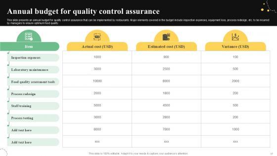 The slide showcases quarterly budget used by companies to evaluate the food quality control procedures and crate an analysis of the product quality before and after being packaged. Presenting this PowerPoint presentation, titled Quarterly Budget For Food Product Packaging And Quality Control Analysis, with topics curated by our researchers after extensive research. This editable presentation is available for immediate download and provides attractive features when used. Download now and captivate your audience. Presenting this Quarterly Budget For Food Product Packaging And Quality Control Analysis. Our researchers have carefully researched and created these slides with all aspects taken into consideration. This is a completely customizable Quarterly Budget For Food Product Packaging And Quality Control Analysis that is available for immediate downloading. Download now and make an impact on your audience. Highlight the attractive features available with our PPTs. The slide showcases quarterly budget used by companies to evaluate the food quality control procedures and crate an analysis of the product quality before and after being packaged.