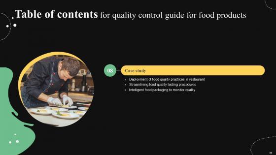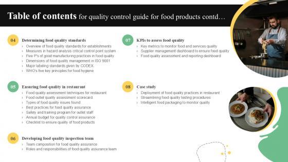 Slidegeeks is here to make your presentations a breeze with Table Of Contents For Quality Control Guide For Food Products PPT Sample With our easy-to-use and customizable templates, you can focus on delivering your ideas rather than worrying about formatting. With a variety of designs to choose from, you are sure to find one that suits your needs. And with animations and unique photos, illustrations, and fonts, you can make your presentation pop. So whether you are giving a sales pitch or presenting to the board, make sure to check out Slidegeeks first Our Table Of Contents For Quality Control Guide For Food Products PPT Sample are topically designed to provide an attractive backdrop to any subject. Use them to look like a presentation pro.