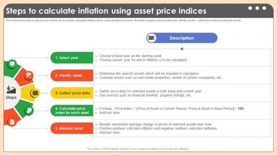 This slide shows step by step process which can be used to calculate inflation rate by using asset price indices. It includes stages such as select year, identify assets,, collect price data and interpret results. Get a simple yet stunning designed Steps To Calculate Inflation Using Asset Price Comprehensive Guide On Inflation Control CM SS V. It is the best one to establish the tone in your meetings. It is an excellent way to make your presentations highly effective. So, download this PPT today from Slidegeeks and see the positive impacts. Our easy-to-edit Steps To Calculate Inflation Using Asset Price Comprehensive Guide On Inflation Control CM SS V can be your go-to option for all upcoming conferences and meetings. So, what are you waiting for Grab this template today. This slide shows step by step process which can be used to calculate inflation rate by using asset price indices. It includes stages such as select year, identify assets,, collect price data and interpret results.