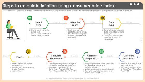 This slide shows step by step process which can be used to calculate inflation rate by using consumer price index. It includes stages such as select year, determine goods, gather price data, calculate price index, etc. From laying roadmaps to briefing everything in detail, our templates are perfect for you. You can set the stage with your presentation slides. All you have to do is download these easy-to-edit and customizable templates. Steps To Calculate Inflation Using Consumer Comprehensive Guide On Inflation Control CM SS V will help you deliver an outstanding performance that everyone would remember and praise you for. Do download this presentation today. This slide shows step by step process which can be used to calculate inflation rate by using consumer price index. It includes stages such as select year, determine goods, gather price data, calculate price index, etc.