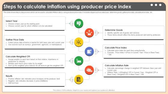 This slide shows step by step process which can be used to calculate inflation rate by using producer price index. It includes stages such as select year, determine goods, gather price data, calculate price index, etc. Present like a pro with Steps To Calculate Inflation Using Producer Comprehensive Guide On Inflation Control CM SS V. Create beautiful presentations together with your team, using our easy-to-use presentation slides. Share your ideas in real-time and make changes on the fly by downloading our templates. So whether you are in the office, on the go, or in a remote location, you can stay in sync with your team and present your ideas with confidence. With Slidegeeks presentation got a whole lot easier. Grab these presentations today. This slide shows step by step process which can be used to calculate inflation rate by using producer price index. It includes stages such as select year, determine goods, gather price data, calculate price index, etc.