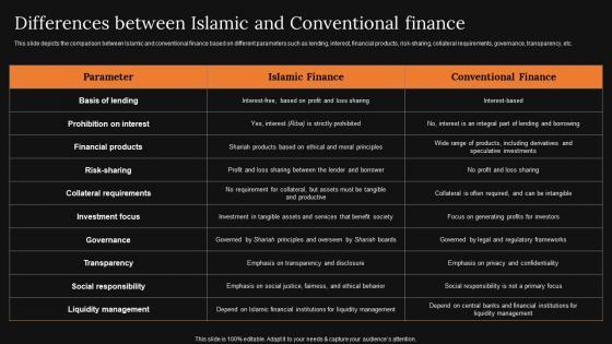 This slide depicts the comparison between Islamic and conventional finance based on different parameters such as lending, interest, financial products, risk sharing, collateral requirements, governance, transparency, etc. There are so many reasons you need a Differences Between Islamic Conventional A Detailed Knowledge Of Islamic Finance Brochure Pdf. The first reason is you can not spend time making everything from scratch, Thus, Slidegeeks has made presentation templates for you too. You can easily download these templates from our website easily. This slide depicts the comparison between Islamic and conventional finance based on different parameters such as lending, interest, financial products, risk sharing, collateral requirements, governance, transparency, etc.