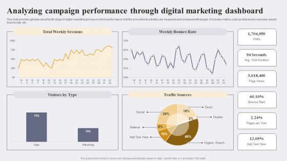 This slide provides glimpse about fourth stage of digital marketing process in which performance of all the promotional activities are measured and compared with targets. It includes metrics such as total weekly sessions, weekly bounce rate, etc.Create an editable Analyzing Campaign Performance Through Enhancing Conversion Rate By Leveraging Guidelines Pdf that communicates your idea and engages your audience. Whether you are presenting a business or an educational presentation, pre-designed presentation templates help save time. Analyzing Campaign Performance Through Enhancing Conversion Rate By Leveraging Guidelines Pdf is highly customizable and very easy to edit, covering many different styles from creative to business presentations. Slidegeeks has creative team members who have crafted amazing templates. So, go and get them without any delay. This slide provides glimpse about fourth stage of digital marketing process in which performance of all the promotional activities are measured and compared with targets. It includes metrics such as total weekly sessions, weekly bounce rate, etc.