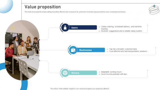 This slide showcases the unique selling proposition offered by the company to its customers. It includes value provided to users, businesses and drivers. Are you in need of a template that can accommodate all of your creative concepts This one is crafted professionally and can be altered to fit any style. Use it with Google Slides or PowerPoint. Include striking photographs, symbols, depictions, and other visuals. Fill, move around, or remove text boxes as desired. Test out color palettes and font mixtures. Edit and save your work, or work with colleagues. Download Value Proposition Provisions Conveyance Business Model BMC SS V and observe how to make your presentation outstanding. Give an impeccable presentation to your group and make your presentation unforgettable. This slide showcases the unique selling proposition offered by the company to its customers. It includes value provided to users, businesses and drivers.