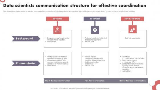 This slide outlines the framework for effective communication coordination among data scientists which assist in team building among the organization. It includes business, technical, data scientists Showcasing this set of slides titled Data Scientists Communication Structure For Effective Coordination Mockup Pdf The topics addressed in these templates are Background, Communicate, Business, Technical All the content presented in this PPT design is completely editable. Download it and make adjustments in color, background, font etc. as per your unique business setting. This slide outlines the framework for effective communication coordination among data scientists which assist in team building among the organization. It includes business, technical, data scientists