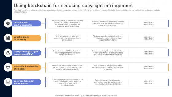 This slide highlights how blockchain technology can be used to reduce copyright infringement in the film and entertainment industry. It includes decentralized proof of ownership, smart contracts, immutable timestamping etc. Make sure to capture your audiences attention in your business displays with our gratis customizable Comprehensive Look At Blockchain Using Blockchain For Reducing Copyright BCT SS V. These are great for business strategies, office conferences, capital raising or task suggestions. If you desire to acquire more customers for your tech business and ensure they stay satisfied, create your own sales presentation with these plain slides. This slide highlights how blockchain technology can be used to reduce copyright infringement in the film and entertainment industry. It includes decentralized proof of ownership, smart contracts, immutable timestamping etc.