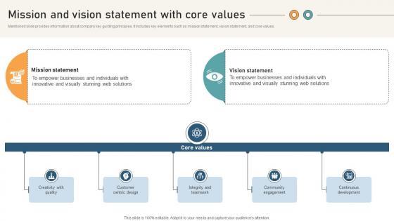 Mentioned slide provides information about company key guiding principles. It includes key elements such as mission statement, vision statement, and core values. Get a simple yet stunning designed Comprehensive Guide For Website Mission And Vision Statement With Core Values. It is the best one to establish the tone in your meetings. It is an excellent way to make your presentations highly effective. So, download this PPT today from Slidegeeks and see the positive impacts. Our easy-to-edit Comprehensive Guide For Website Mission And Vision Statement With Core Values can be your go-to option for all upcoming conferences and meetings. So, what are you waiting for Grab this template today. Mentioned slide provides information about company key guiding principles. It includes key elements such as mission statement, vision statement, and core values.
