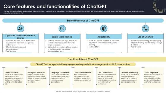 This slide provides information regarding major features of ChatGPT platform in terms of adaptability, high quality responses to queries along with functionalities of platform in terms of text generation, dialogue generation, question answering, text completion, etc. This Core Features And Functionalities Of Chatgpt Platform Portrait PDF from Slidegeeks makes it easy to present information on your topic with precision. It provides customization options, so you can make changes to the colors, design, graphics, or any other component to create a unique layout. It is also available for immediate download, so you can begin using it right away. Slidegeeks has done good research to ensure that you have everything you need to make your presentation stand out. Make a name out there for a brilliant performance.