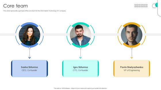 This slide represents a glimpse of the core team for the Information Technology IT company. Do you have to make sure that everyone on your team knows about any specific topic I yes, then you should give Core Team Function User Interface Service Investor Funding Elevator Pitch Deck a try. Our experts have put a lot of knowledge and effort into creating this impeccable Core Team Function User Interface Service Investor Funding Elevator Pitch Deck. You can use this template for your upcoming presentations, as the slides are perfect to represent even the tiniest detail. You can download these templates from the Slidegeeks website and these are easy to edit. So grab these today This slide represents a glimpse of the core team for the Information Technology IT company.