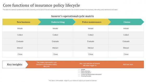 This slide showcases an operational cycle matrix presenting core functions of insurance policy lifecycle at organizational level. Key functions consists of new business, underwriting, policy maintenance and claims. Crafting an eye-catching presentation has never been more straightforward. Let your presentation shine with this tasteful yet straightforward Technology Trends In Online Insurance Core Functions Of Insurance Policy Lifecycle template. It offers a minimalistic and classy look that is great for making a statement. The colors have been employed intelligently to add a bit of playfulness while still remaining professional. Construct the ideal Technology Trends In Online Insurance Core Functions Of Insurance Policy Lifecycle that effortlessly grabs the attention of your audience Begin now and be certain to wow your customers This slide showcases an operational cycle matrix presenting core functions of insurance policy lifecycle at organizational level. Key functions consists of new business, underwriting, policy maintenance and claims.