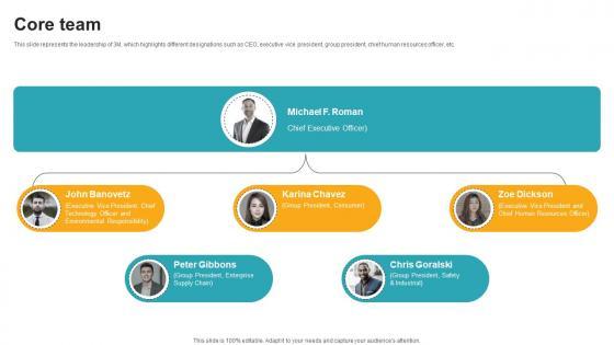 This slide represents the leadership of 3M, which highlights different designations such as CEO, executive vice president, group president, chief human resources officer, etc.There are so many reasons you need a Core Team Innovative Industrial Solutions Company Profile CP SS V. The first reason is you can not spend time making everything from scratch, Thus, Slidegeeks has made presentation templates for you too. You can easily download these templates from our website easily. This slide represents the leadership of 3M, which highlights different designations such as CEO, executive vice president, group president, chief human resources officer, etc.