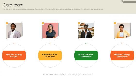 This slide covers various members that constitute a part of founding team of Rovilus. Key founding positions include Founder, Cofounder, CEO, sales advisor and board member. There are so many reasons you need a Core Team Battery Production Firm Investor Funding Elevator Pitch Deck The first reason is you can not spend time making everything from scratch, Thus, Slidegeeks has made presentation templates for you too. You can easily download these templates from our website easily. This slide covers various members that constitute a part of founding team of Rovilus. Key founding positions include Founder, Cofounder, CEO, sales advisor and board member.