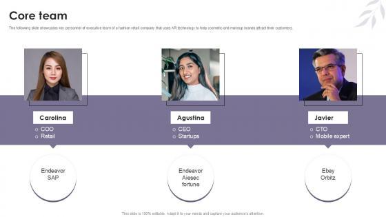 The following slide showcases key personnel of executive team of a fashion retail company that uses AR technology to help cosmetic and makeup brands attract their customers. Do you have to make sure that everyone on your team knows about any specific topic I yes, then you should give Core Team Cosmetic Products Platform Investor Ppt Slides a try. Our experts have put a lot of knowledge and effort into creating this impeccable Core Team Cosmetic Products Platform Investor Ppt Slides. You can use this template for your upcoming presentations, as the slides are perfect to represent even the tiniest detail. You can download these templates from the Slidegeeks website and these are easy to edit. So grab these today The following slide showcases key personnel of executive team of a fashion retail company that uses AR technology to help cosmetic and makeup brands attract their customers.
