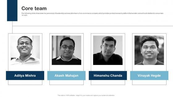 The following slide showcases key personnel of leadership and executive team of an ecommerce company which provides product research platform that assists connect local retailers to consumers on web. Do you have to make sure that everyone on your team knows about any specific topic I yes, then you should give Core Team Product Research Fund Raising Pitch Deck Diagrams Pdf a try. Our experts have put a lot of knowledge and effort into creating this impeccable Core Team Product Research Fund Raising Pitch Deck Diagrams Pdf. You can use this template for your upcoming presentations, as the slides are perfect to represent even the tiniest detail. You can download these templates from the Slidegeeks website and these are easy to edit. So grab these today The following slide showcases key personnel of leadership and executive team of an ecommerce company which provides product research platform that assists connect local retailers to consumers on web.