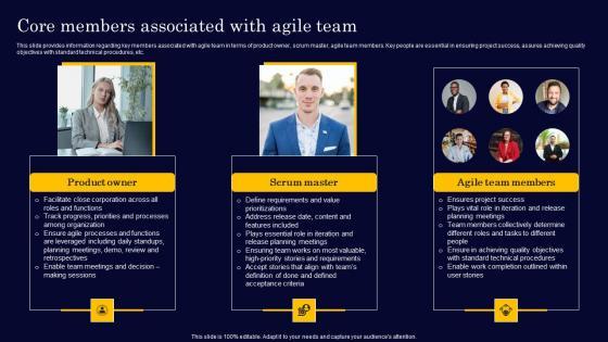 This slide provides information regarding key members associated with agile team in terms of product owner, scrum master, agile team members. Key people are essential in ensuring project success, assures achieving quality objectives with standard technical procedures, etc. Slidegeeks is one of the best resources for PowerPoint templates. You can download easily and regulate Core Members Associated With Agile Team Playbook For Managing Us Demonstration Pdf for your personal presentations from our wonderful collection. A few clicks is all it takes to discover and get the most relevant and appropriate templates. Use our Templates to add a unique zing and appeal to your presentation and meetings. All the slides are easy to edit and you can use them even for advertisement purposes. This slide provides information regarding key members associated with agile team in terms of product owner, scrum master, agile team members. Key people are essential in ensuring project success, assures achieving quality objectives with standard technical procedures, etc.