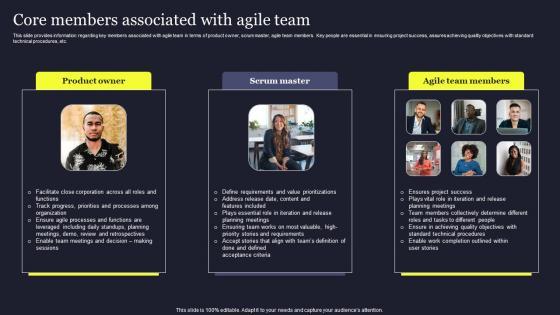 This slide provides information regarding key members associated with agile team in terms of product owner, scrum master, agile team members. Key people are essential in ensuring project success, assures achieving quality objectives with standard technical procedures, etc. If your project calls for a presentation, then Slidegeeks is your go-to partner because we have professionally designed, easy-to-edit templates that are perfect for any presentation. After downloading, you can easily edit Core Members Associated With Agile Team Public Sector Digital Solutions Template Pdf and make the changes accordingly. You can rearrange slides or fill them with different images. Check out all the handy templates This slide provides information regarding key members associated with agile team in terms of product owner, scrum master, agile team members. Key people are essential in ensuring project success, assures achieving quality objectives with standard technical procedures, etc.
