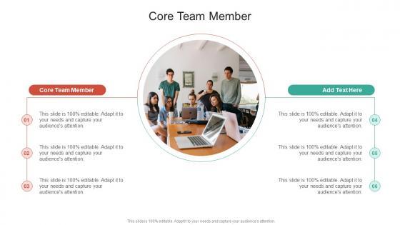 Introducing our well designed Core Team Member In Powerpoint And Google Slides Cpb. This PowerPoint design presents information on topics like Core Team Member. As it is predesigned it helps boost your confidence level. It also makes you a better presenter because of its high quality content and graphics. This PPT layout can be downloaded and used in different formats like PDF, PNG, and JPG. Not only this, it is available in both Standard Screen and Widescreen aspect ratios for your convenience. Therefore, click on the download button now to persuade and impress your audience. Our Core Team Member In Powerpoint And Google Slides Cpb are topically designed to provide an attractive backdrop to any subject. Use them to look like a presentation pro.