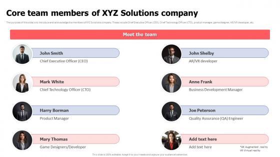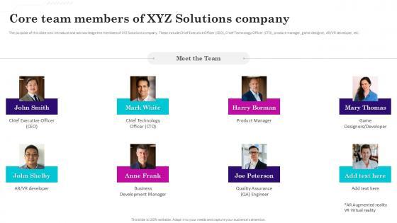 The purpose of this slide is to introduce and acknowledge the members of XYZ Solutions company. These include Chief Executive Officer CEO, Chief Technology Officer CTO, product manager, game designer, ARorVR developer, etc. Want to ace your presentation in front of a live audience Our Core Team Members Of XYZ Solutions Company Video Game Financing Pitch Deck can help you do that by engaging all the users towards you. Slidegeeks experts have put their efforts and expertise into creating these impeccable powerpoint presentations so that you can communicate your ideas clearly. Moreover, all the templates are customizable, and easy to edit and downloadable. Use these for both personal and commercial use. The purpose of this slide is to introduce and acknowledge the members of XYZ Solutions company. These include Chief Executive Officer CEO, Chief Technology Officer CTO, product manager, game designer, ARorVR developer, etc.