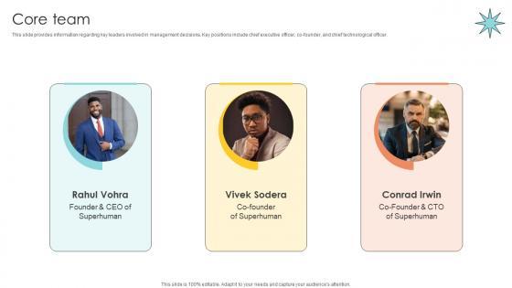 This slide provides information regarding key leaders involved in management decisions. Key positions include chief executive officer, co-founder, and chief technological officer. Do you have to make sure that everyone on your team knows about any specific topic I yes, then you should give Core Team Email Management Technology Pitch Deck a try. Our experts have put a lot of knowledge and effort into creating this impeccable Core Team Email Management Technology Pitch Deck. You can use this template for your upcoming presentations, as the slides are perfect to represent even the tiniest detail. You can download these templates from the Slidegeeks website and these are easy to edit. So grab these today This slide provides information regarding key leaders involved in management decisions. Key positions include chief executive officer, co-founder, and chief technological officer.