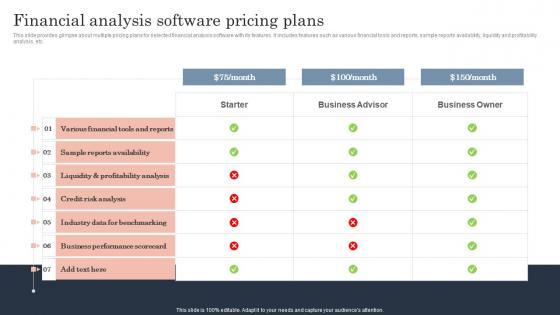 This slide provides glimpse about multiple pricing plans for selected financial analysis software with its features. It includes features such as various financial tools and reports, sample reports availability, liquidity and profitability analysis, etc.The best PPT templates are a great way to save time, energy, and resources. Slidegeeks have 100Precent editable powerpoint slides making them incredibly versatile. With these quality presentation templates, you can create a captivating and memorable presentation by combining visually appealing slides and effectively communicating your message. Download Financial Analysis Software Pricing Plans Guide To Corporate Financial Growth Plan Icons Pdf from Slidegeeks and deliver a wonderful presentation. This slide provides glimpse about multiple pricing plans for selected financial analysis software with its features. It includes features such as various financial tools and reports, sample reports availability, liquidity and profitability analysis, etc.