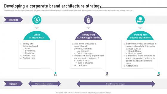 This slide presents an overview of the strategy to define brand architecture. It includes steps such as defining brand potential, identifying brand extension opportunities, and branding new products and services. This modern and well-arranged Brand Equity Management To Raise Developing A Corporate Brand Architecture Strategy provides lots of creative possibilities. It is very simple to customize and edit with the Powerpoint Software. Just drag and drop your pictures into the shapes. All facets of this template can be edited with Powerpoint, no extra software is necessary. Add your own material, put your images in the places assigned for them, adjust the colors, and then you can show your slides to the world, with an animated slide included. This slide presents an overview of the strategy to define brand architecture. It includes steps such as defining brand potential, identifying brand extension opportunities, and branding new products and services.