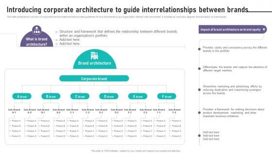 This slide presents an overview of corporate brand architecture that provides guidelines for how the brands in your organization interact with one another. It includes an overview, diagram, and its impact on brand equity. Take your projects to the next level with our ultimate collection of Brand Equity Management To Raise Introducing Corporate Architecture To Guide. Slidegeeks has designed a range of layouts that are perfect for representing task or activity duration, keeping track of all your deadlines at a glance. Tailor these designs to your exact needs and give them a truly corporate look with your own brand colors they will make your projects stand out from the rest. This slide presents an overview of corporate brand architecture that provides guidelines for how the brands in your organization interact with one another. It includes an overview, diagram, and its impact on brand equity.