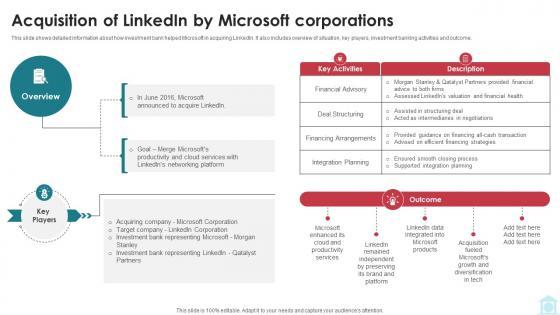 This slide shows detailed information about how investment bank helped Microsoft in acquiring LinkedIn. It also includes overview of situation, key players, investment banking activities and outcome. Find a pre-designed and impeccable Acquisition Of LinkedIn By Microsoft Corporations Mastering Investment Banking Fin SS V The templates can ace your presentation without additional effort. You can download these easy-to-edit presentation templates to make your presentation stand out from others. So, what are you waiting for Download the template from Slidegeeks today and give a unique touch to your presentation. This slide shows detailed information about how investment bank helped Microsoft in acquiring LinkedIn. It also includes overview of situation, key players, investment banking activities and outcome.