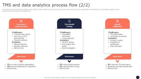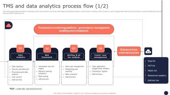 This slide represents transaction monitoring system process flow. It provides information about data analytics, risk framework, alerting, ad hoc analysis, case management, external source entrance, stop list, politically exposed persons PEP, watch list, etc. Want to ace your presentation in front of a live audience Our TMS And Data Analytics Process Flow Mitigating Corporate Scams And Robberies Topics Pdf Inspiration Pdf can help you do that by engaging all the users towards you. Slidegeeks experts have put their efforts and expertise into creating these impeccable powerpoint presentations so that you can communicate your ideas clearly. Moreover, all the templates are customizable, and easy-to-edit and downloadable. Use these for both personal and commercial use. This slide represents transaction monitoring system process flow. It provides information about data analytics, risk framework, alerting, ad hoc analysis, case management, external source entrance, stop list, politically exposed persons PEP, watch list, etc.