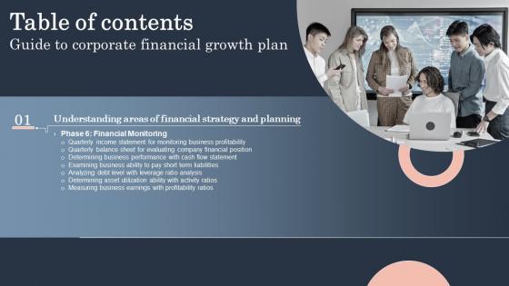 The Guide To Corporate Financial Growth Plan Table Of Contents Icons Pdf is a compilation of the most recent design trends as a series of slides. It is suitable for any subject or industry presentation, containing attractive visuals and photo spots for businesses to clearly express their messages. This template contains a variety of slides for the user to input data, such as structures to contrast two elements, bullet points, and slides for written information. Slidegeeks is prepared to create an impression. Our Guide To Corporate Financial Growth Plan Table Of Contents Icons Pdf are topically designed to provide an attractive backdrop to any subject. Use them to look like a presentation pro.
