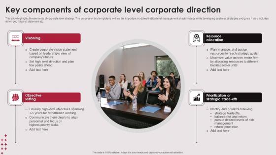 This slide highlights the elements of corporate level strategy. The purpose of this template is to draw the important modules that top level management should include while developing business strategies and goals. It also includes vision and mission statement etc. Showcasing this set of slides titled Key Components Of Corporate Level Corporate Direction Guidelines PDF. The topics addressed in these templates are Visioning, Resource Allocation, Objective Setting. All the content presented in this PPT design is completely editable. Download it and make adjustments in color, background, font etc. as per your unique business setting. This slide highlights the elements of corporate level strategy. The purpose of this template is to draw the important modules that top level management should include while developing business strategies and goals. It also includes vision and mission statement etc.