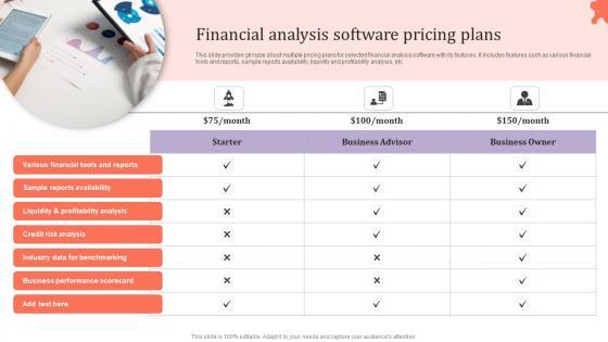 This slide provides glimpse about multiple pricing plans for selected financial analysis software with its features. It includes features such as various financial tools and reports, sample reports availability, liquidity and profitability analysis, etc. QExplore a selection of the finest Financial Analysis Software Pricing Plans Assessing Corporate Financial Techniques Mockup Pdf here. With a plethora of professionally designed and pre made slide templates, you can quickly and easily find the right one for your upcoming presentation. You can use our Financial Analysis Software Pricing Plans Assessing Corporate Financial Techniques Mockup Pdf to effectively convey your message to a wider audience. Slidegeeks has done a lot of research before preparing these presentation templates. The content can be personalized and the slides are highly editable. Grab templates today from Slidegeeks. This slide provides glimpse about multiple pricing plans for selected financial analysis software with its features. It includes features such as various financial tools and reports, sample reports availability, liquidity and profitability analysis, etc.