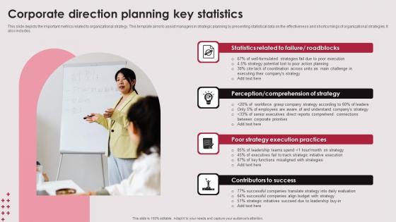 This slide depicts the important metrics related to organizational strategy. This template aims to assist managers in strategic planning by presenting statistical data on the effectiveness and shortcomings of organizational strategies. It also includes. Showcasing this set of slides titled Corporate Direction Planning Key Statistics Topics PDF. The topics addressed in these templates are Statistics Related To Failure, Comprehension Of Strategy, Contributors To Success. All the content presented in this PPT design is completely editable. Download it and make adjustments in color, background, font etc. as per your unique business setting. This slide depicts the important metrics related to organizational strategy. This template aims to assist managers in strategic planning by presenting statistical data on the effectiveness and shortcomings of organizational strategies. It also includes.