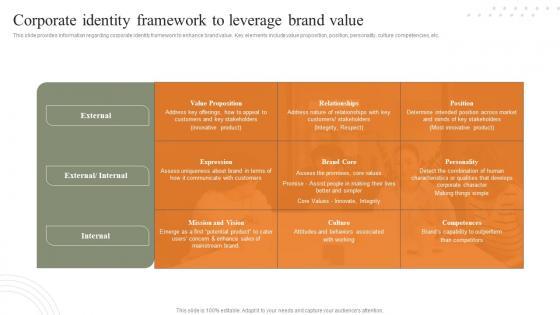 This slide provides information regarding corporate identity framework to enhance brand value. Key elements include value proposition, position, personality, culture competencies, etc. Want to ace your presentation in front of a live audience Our Corporate Identity Framework To Leverage Brand Value Strategies For Achieving Infographics Pdf can help you do that by engaging all the users towards you. Slidegeeks experts have put their efforts and expertise into creating these impeccable powerpoint presentations so that you can communicate your ideas clearly. Moreover, all the templates are customizable, and easy-to-edit and downloadable. Use these for both personal and commercial use. This slide provides information regarding corporate identity framework to enhance brand value. Key elements include value proposition, position, personality, culture competencies, etc.
