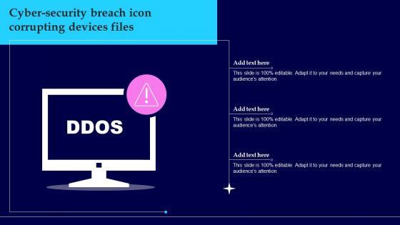 Pitch your topic with ease and precision using this Cyber Security Breach Icon Corrupting Devices Files Pictures Pdf This layout presents information on Cyber Security Breach, Icon Corrupting Devices Files It is also available for immediate download and adjustment. So, changes can be made in the color, design, graphics or any other component to create a unique layout. Our Cyber Security Breach Icon Corrupting Devices Files Pictures Pdf are topically designed to provide an attractive backdrop to any subject. Use them to look like a presentation pro.
