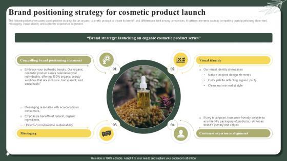 The following slide showcases brand position strategy for an organic cosmetic product to create its identify and differentiate itself among competitors. It outlines elements such as compelling brand positioning statement, messaging, visual identity and customer experience alignment. Slidegeeks is one of the best resources for PowerPoint templates. You can download easily and regulate Brand Positioning Strategy For Cosmetic Product Launch Successful Launch Ppt Slide for your personal presentations from our wonderful collection. A few clicks is all it takes to discover and get the most relevant and appropriate templates. Use our Templates to add a unique zing and appeal to your presentation and meetings. All the slides are easy to edit and you can use them even for advertisement purposes. The following slide showcases brand position strategy for an organic cosmetic product to create its identify and differentiate itself among competitors. It outlines elements such as compelling brand positioning statement, messaging, visual identity and customer experience alignment.