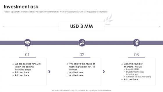 This slide represents the information related to the investment requirements to the investors for seeking needed funds and the purpose of seeking finance. Find highly impressive Investment Ask Cosmetic Products Platform Investor Ppt Example on Slidegeeks to deliver a meaningful presentation. You can save an ample amount of time using these presentation templates. No need to worry to prepare everything from scratch because Slidegeeks experts have already done a huge research and work for you. You need to download Investment Ask Cosmetic Products Platform Investor Ppt Example for your upcoming presentation. All the presentation templates are 100 percent editable and you can change the color and personalize the content accordingly. Download now This slide represents the information related to the investment requirements to the investors for seeking needed funds and the purpose of seeking finance.