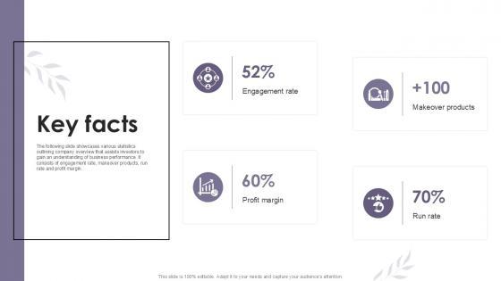 The following slide showcases various statistics outlining company overview that assists investors to gain an understanding of business performance. It consists of engagement rate, makeover products, run rate and profit margin. If your project calls for a presentation, then Slidegeeks is your go-to partner because we have professionally designed, easy-to-edit templates that are perfect for any presentation. After downloading, you can easily edit Key Facts Cosmetic Products Platform Investor Ppt Slides and make the changes accordingly. You can rearrange slides or fill them with different images. Check out all the handy templates The following slide showcases various statistics outlining company overview that assists investors to gain an understanding of business performance. It consists of engagement rate, makeover products, run rate and profit margin.