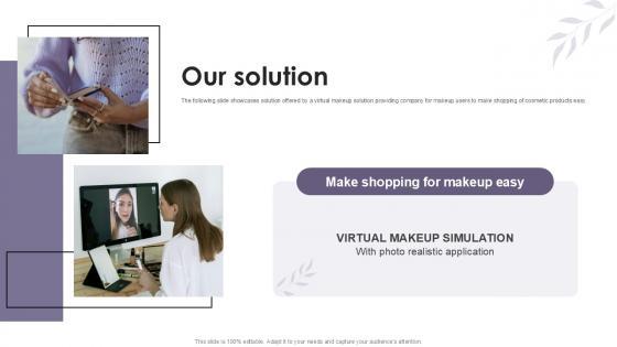 The following slide showcases solution offered by a virtual makeup solution providing company for makeup users to make shopping of cosmetic products easy. Make sure to capture your audiences attention in your business displays with our gratis customizable Our Solution Cosmetic Products Platform Investor Ppt Example. These are great for business strategies, office conferences, capital raising or task suggestions. If you desire to acquire more customers for your tech business and ensure they stay satisfied, create your own sales presentation with these plain slides. The following slide showcases solution offered by a virtual makeup solution providing company for makeup users to make shopping of cosmetic products easy.
