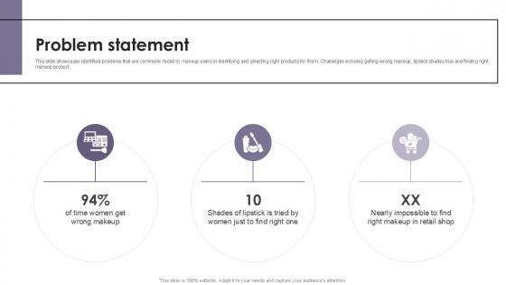 This slide showcases identified problems that are commonly faced by makeup users in identifying and selecting right products for them. Challenges includes getting wrong makeup, lipstick shades trial and finding right makeup product. Formulating a presentation can take up a lot of effort and time, so the content and message should always be the primary focus. The visuals of the PowerPoint can enhance the presenters message, so our Problem Statement Cosmetic Products Platform Investor Ppt Slides was created to help save time. Instead of worrying about the design, the presenter can concentrate on the message while our designers work on creating the ideal templates for whatever situation is needed. Slidegeeks has experts for everything from amazing designs to valuable content, we have put everything into Problem Statement Cosmetic Products Platform Investor Ppt Slides This slide showcases identified problems that are commonly faced by makeup users in identifying and selecting right products for them. Challenges includes getting wrong makeup, lipstick shades trial and finding right makeup product.