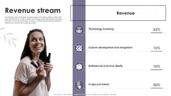 The following slide showcases revenue streams of a fashion retail company that uses AR technology to help cosmetic and makeup brands attract their customers. Revenue sources are technology licensing, customer development and integration, software as a service and in app purchases. This modern and well-arranged Revenue Stream Cosmetic Products Platform Investor Ppt Example provides lots of creative possibilities. It is very simple to customize and edit with the Powerpoint Software. Just drag and drop your pictures into the shapes. All facets of this template can be edited with Powerpoint, no extra software is necessary. Add your own material, put your images in the places assigned for them, adjust the colors, and then you can show your slides to the world, with an animated slide included. The following slide showcases revenue streams of a fashion retail company that uses AR technology to help cosmetic and makeup brands attract their customers. Revenue sources are technology licensing, customer development and integration, software as a service and in app purchases.
