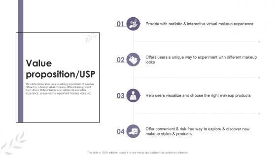This slide showcases unique selling propositions of solution offered by a fashion retail company differentiates product from others. Differentiators are realistics and interactive experience, unique way to experiment makeup looks, etc. Explore a selection of the finest Value Proposition USP Cosmetic Products Platform Investor Ppt Sample here. With a plethora of professionally designed and pre-made slide templates, you can quickly and easily find the right one for your upcoming presentation. You can use our Value Proposition USP Cosmetic Products Platform Investor Ppt Sample to effectively convey your message to a wider audience. Slidegeeks has done a lot of research before preparing these presentation templates. The content can be personalized and the slides are highly editable. Grab templates today from Slidegeeks. This slide showcases unique selling propositions of solution offered by a fashion retail company differentiates product from others. Differentiators are realistics and interactive experience, unique way to experiment makeup looks, etc.