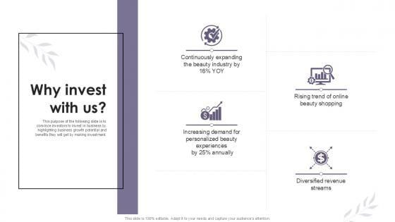 This purpose of the following slide is to convince investors to invest in business by highlighting business growth potential and benefits they will get by making investment. The best PPT templates are a great way to save time, energy, and resources. Slidegeeks have 100 percent editable powerpoint slides making them incredibly versatile. With these quality presentation templates, you can create a captivating and memorable presentation by combining visually appealing slides and effectively communicating your message. Download Why Invest With Us Cosmetic Products Platform Investor Ppt Slides from Slidegeeks and deliver a wonderful presentation. This purpose of the following slide is to convince investors to invest in business by highlighting business growth potential and benefits they will get by making investment.