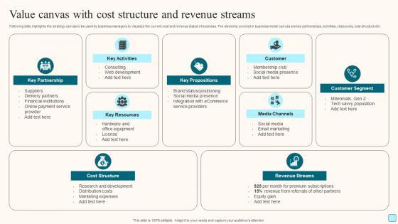 Following slide highlights the strategy canvas to be used by business managers to visualize the current cost and revenue status of business. The elements covered in business model canvas are key partnerships, activities, resources, cost structure etc. Pitch your topic with ease and precision using this Value Canvas With Cost Structure And Revenue Streams Elements Pdf. This layout presents information on Key Propositions, Media Channels, Customer Segment, Revenue Streams. It is also available for immediate download and adjustment. So, changes can be made in the color, design, graphics or any other component to create a unique layout. Following slide highlights the strategy canvas to be used by business managers to visualize the current cost and revenue status of business. The elements covered in business model canvas are key partnerships, activities, resources, cost structure etc.