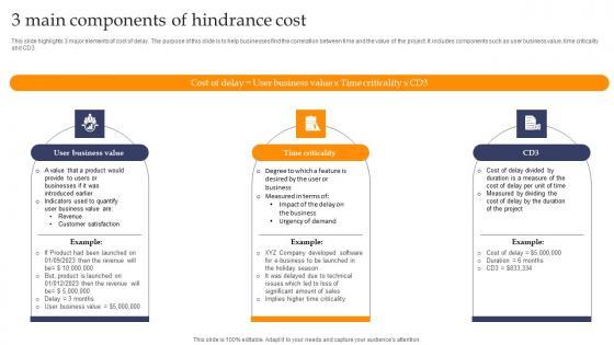 This slide highlights 3 major elements of cost of delay. The purpose of this slide is to help businesses find the correlation between time and the value of the project. It includes components such as user business value, time criticality and CD3. Showcasing this set of slides titled 3 Main Components Of Hindrance Cost Mockup pdf. The topics addressed in these templates are Building Report, Naming Report, Project Health. All the content presented in this PPT design is completely editable. Download it and make adjustments in color, background, font etc. as per your unique business setting. This slide highlights 3 major elements of cost of delay. The purpose of this slide is to help businesses find the correlation between time and the value of the project. It includes components such as user business value, time criticality and CD3.