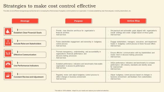 This slide covers different managerial approaches that aid in increasing the effectiveness of budgetary control systems in an organization. It includes establishing clear financial goals, including stakeholders, etc. Pitch your topic with ease and precision using this Strategies To Make Cost Control Effective Demonstration Pdf. This layout presents information on Strategy, Purpose, Action Step. It is also available for immediate download and adjustment. So, changes can be made in the color, design, graphics or any other component to create a unique layout. This slide covers different managerial approaches that aid in increasing the effectiveness of budgetary control systems in an organization. It includes establishing clear financial goals, including stakeholders, etc.